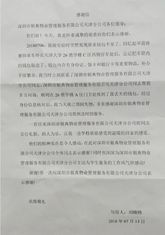 2018年7月6日早上,一名天津大學自動化學院的學生因著急回實驗室做實驗,在第26教學樓C區(qū)西側停車處停放共享單車時,一時疏忽,忘記將車筐內錢包取走,錢包內有身份證、學生一卡通、銀行卡等重要證件,此類證件一旦遺失,補辦手續(xù)相當繁雜。故當該名學生想起錢包未取返回停車處時,發(fā)現錢包已不見,內心非常焦急,經多方問詢,得知錢包已被我司外圍巡邏崗工作人員放于第26教學樓A區(qū)一層值班室,以便失主認領時,焦急的心情總算平復一些。